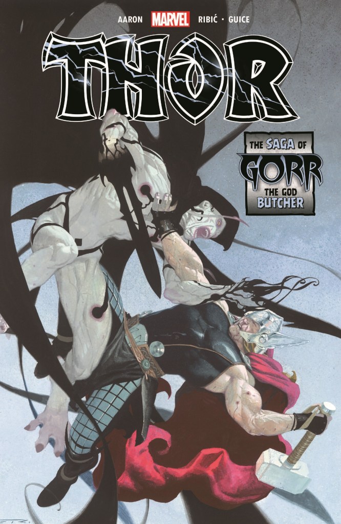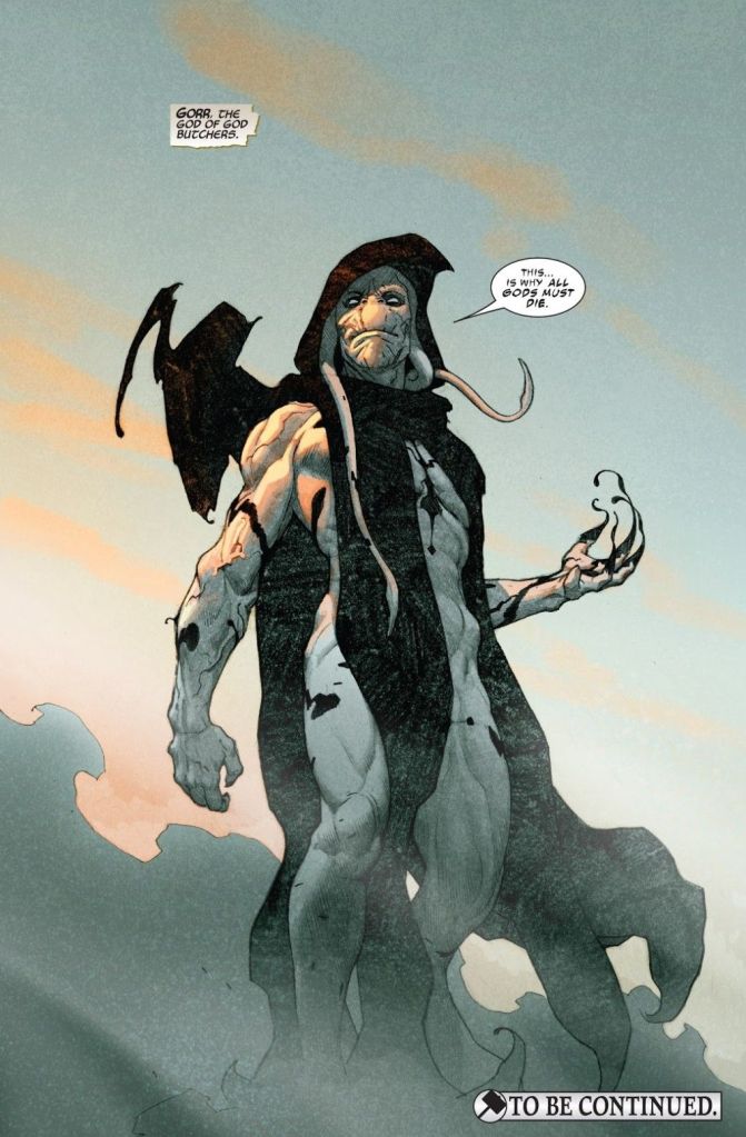 The Saga of Gorr the God Butcher spans issues 1-11 of the Thor Jason Aaron run. The premise is that Thor encounters dead gods and while trying to figure out the cause of this encounters an entity only spoken of in whispers and in fear, Gorr the God Butcher. The entire story spans 3 different timelines which ultimately collide in the end for one epic battle. Each timeline has its own Thor who has faced the God Butcher. We see early era vikin Thor who is still quite young and still hasn’t earned the right or been deemed worthy to lift Mjolnir. We have the Avengers era Thor, the one that we are most familiar with, and finally we have All-father Thor who has ascended to become the all-father and the king of Asgard. We get a glimpse of each of their lives and how the encounter with Gorr has changed them. All the while we see a scheming Gorr on his quest to kill all Gods.